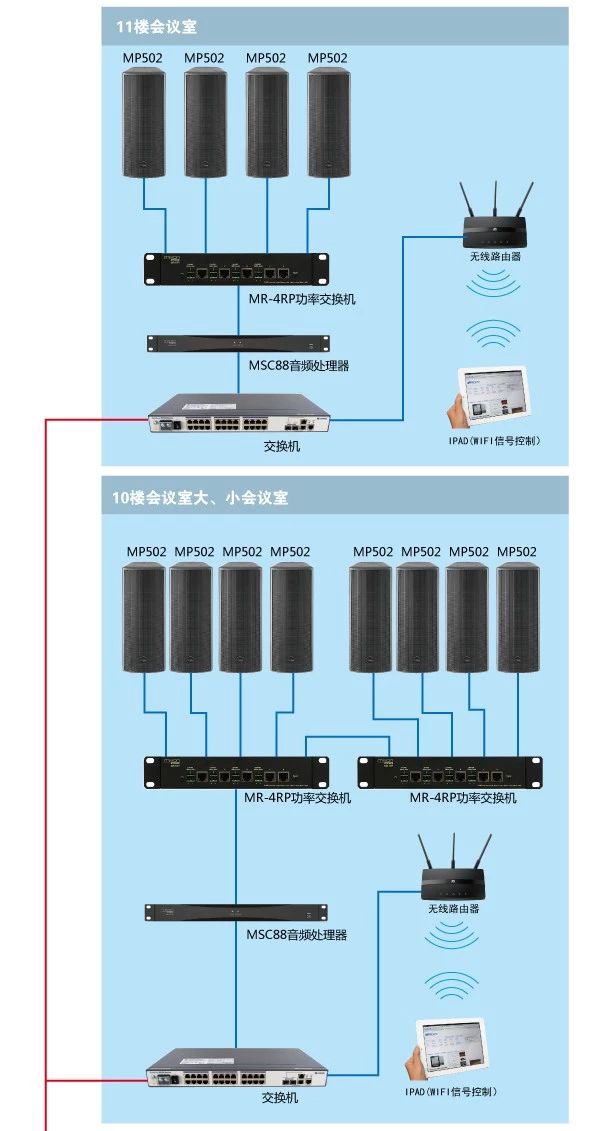 考慮到業(yè)主的實(shí)際需求,前期結(jié)合工程圖紙與業(yè)主進(jìn)行了充分溝通,業(yè)主通過與同類產(chǎn)品的多次對比,最終選擇了擁有40多年先進(jìn)技術(shù)經(jīng)驗(yàn)的英國知名音響品牌——Mission Pro美聲網(wǎng)絡(luò)音頻系列產(chǎn)品,應(yīng)用場所涉及整座大樓13間大、小會議室和1間視頻會議室(多功能廳)
