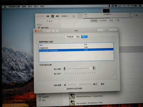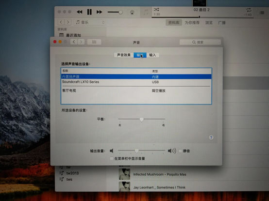 圖20:這里用的是OS系統(tǒng)自帶播放器,有些播放器可能需要在軟件本身再做一次聲卡輸出的選擇。另WIN系統(tǒng)也一樣要先把系統(tǒng)聲音輸入輸出選項有電腦本身揚聲器改為LX10調音臺聲卡;低版本的WIN系統(tǒng)有可能還需要安裝LX10聲卡驅動。