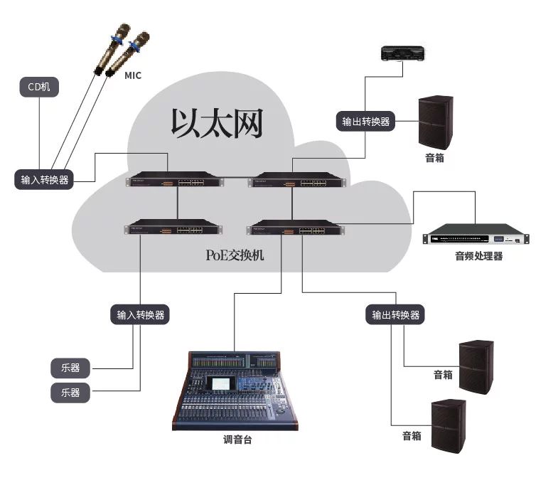 Dante技術可以在以太網(100M或者1000M)上傳送高精度時鐘信號以及專業音頻信號并可以進行復雜的路由??梢匀斡梢纛l信號在以太網中使用TCP/IP方式任意傳送,而且在這個過程中保持了信號的精確還原。下圖直觀反應了DANTE網絡的連接工作方式: