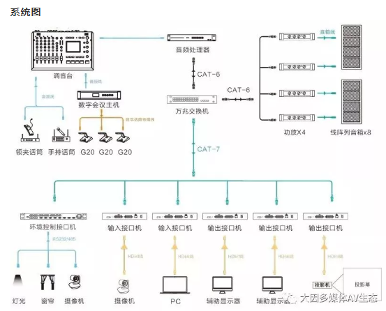 小會議室定位于圓桌討論會議室,主要應用于日常會議、圓桌討論等。因此需要滿足一般性的會議語言類的擴聲和視頻顯示的功能。同時如果作為分會場使用時需要滿足把主會場的音視頻信號實時的發送到小會議室來。