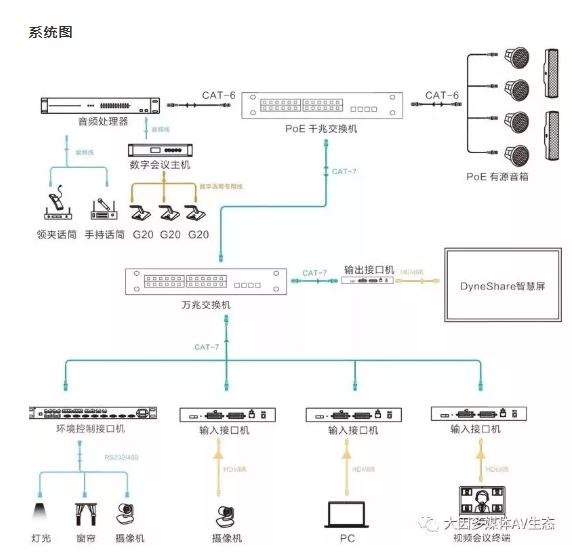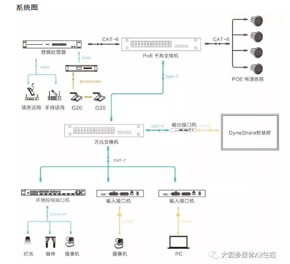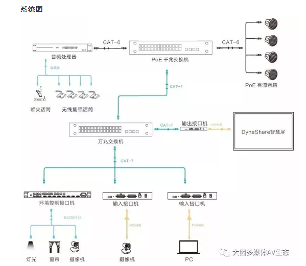 會議室是信息交互的平臺,實現信息的傳遞主要是兩種方式,就是視和聽。視覺的內容主要是圖像和文字資料,聽覺的內容則是聲音。DANACOID通過DyneNet和DynePro系列打造音視頻全IP化系統。通過網線完成音視頻信號的傳輸、管理和控制,打造最佳的會議室視聽效果。