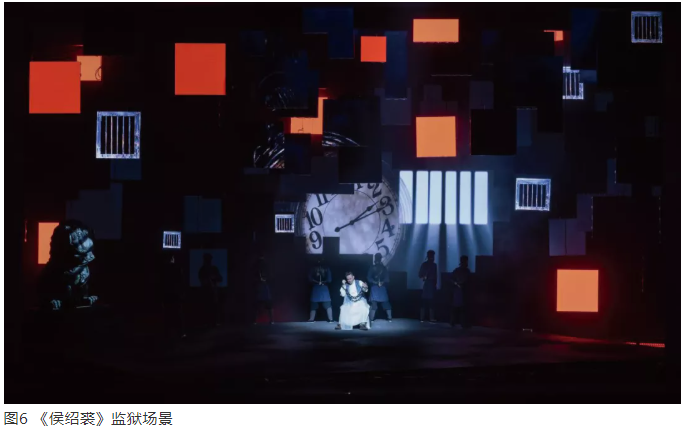 比如,劇中監獄窗格透出的光束形象是屏幕形象,而不是燈光光影形象(圖6)。它是一種光景,借助多媒體手段創造的環境形象。在這個屏幕形象呈現過程中,舞臺燈光也創造與其相一致的光影效果,通過視覺錯視,使平面和立體效果產生關系,進而形成渾然一體的戲劇動作空間。多媒體的形象和燈光的形象是一體的,而且多媒體形象作為一個完整的形象,視覺效果特別奪目,在信息傳遞上又特別有效。對于當代的燈光設計,多熟悉多媒體技術和手段,是很有價值的?,F代戲劇有一個顯著的特征,不是手段匱乏,而是手段太多。在戲劇空間中,如何節制地運用技術手段,是當代舞臺空間演出中一個特別值得思考的話題。