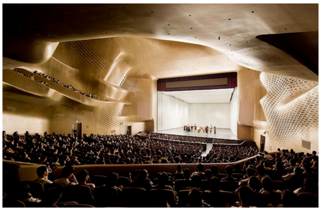 為了減小回聲、提高語言清晰度,同時加強(qiáng)混響,提升音樂豐滿性,劇院歌劇廳內(nèi)飾面、座位等的材料選擇與外形設(shè)計十分重要。一般情況下聲音最佳反射時間為1-1.3秒。