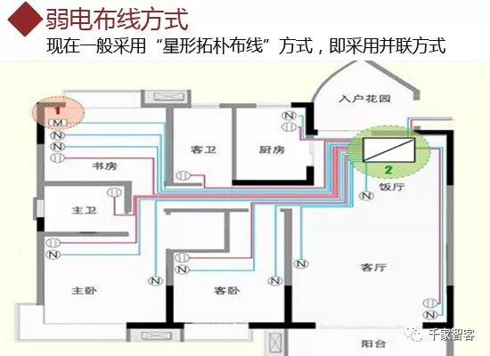家庭弱電布線的絕大部分都是采用"星形拓樸布線"方式,即采用并聯方式,集中匯聚到弱電箱中實行集中管理。這是對過去"總線拓樸結構"的代替,并聯強調的是每條線路都是獨立的,能夠避免單點故障導致整個系統的癱瘓,也方便單條線路進行拓展。