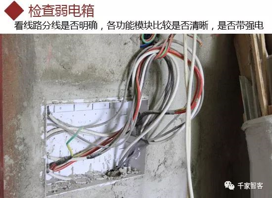首先要檢查弱電箱,看線路分線是否明確,各功能模塊比較是否清晰。同時要特別注意弱電箱里面不能有裸露的強電,建議在弱電驗收的時候帶上一只電筆,避免工人將強電誤裝到弱電系統上。
