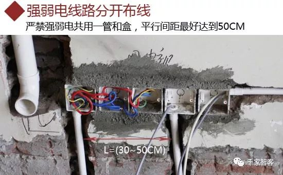 電路改造時一大禁忌,就是施工隊為了施工方便,將所有線路收納到一起。這樣做的后果是線路之間會受到干擾,導致信號不穩定,而且還會留下火災隱患。因此在電路改造的時候,強弱電應該分開走線,嚴禁強弱電共用一管和一個底盒,強電線路平行間距不能低于30cm,最好是50cm,交叉必須成直角。