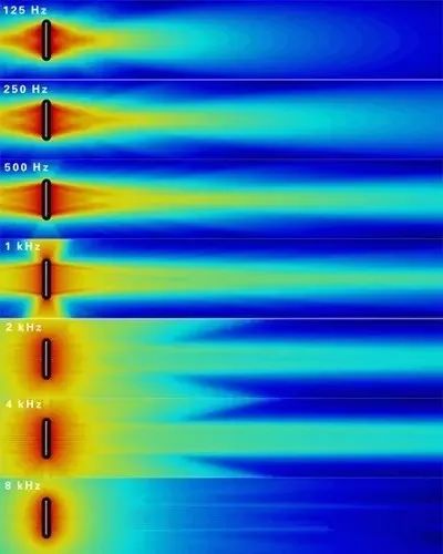 然而,隨著聲音傳播距離的增加,即使典型的定向揚聲器(例如具有90°水平覆蓋角和90°垂直覆蓋角的號筒揚聲器)也會遵從于反平方定律,像理論上的點聲源一樣進行聲音的擴散(即全向輻射)。