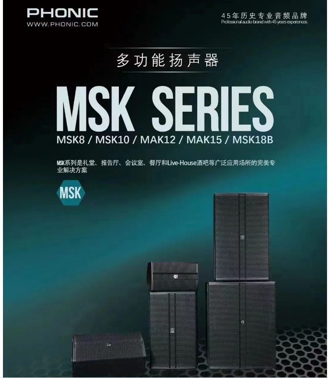 MSK系列是一系列完整的全頻揚聲器和低頻揚聲器,多功能箱體設計用于PA系統或舞臺返送揚聲器,全頻底部配置雙角度支撐座。產品包括8"、10"、12"和15"兩分頻型號和一款18"超低音揚聲器,內置高品質分頻器提供線性相位響應,具有出色的聲音分布和保真度,全頻揚聲器配備高頻OCPP保護。