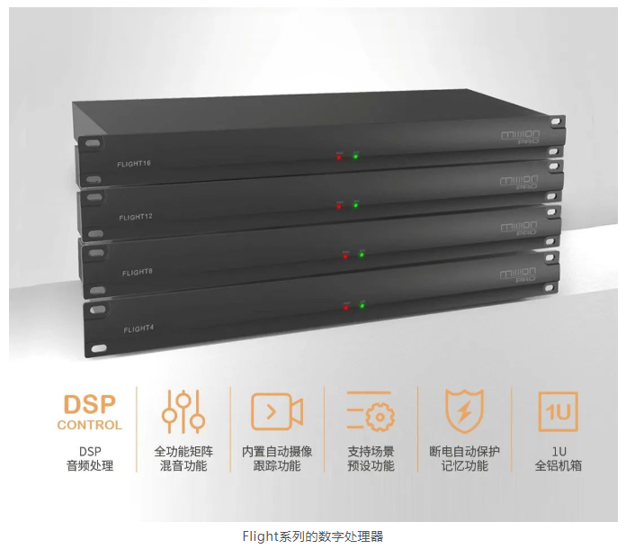 為了優化聲音效果,數字處理系統采用Mission的Flight系列的數字處理器。Flight系列音頻處理器是一個可以自由設計的音頻處理和控制系統。它采用先進的DSP處理技術,擁有全新的自動混音、反饋消除等算法,針對性的解決應用場景中的各種實際問題。使用最新的優化預設為Mission的擴聲系統增加了動態均衡的處理,確保音質得到大幅度的優化。