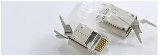 可以看到,七類網線水晶頭,帶有金屬屏蔽外殼。因為7類線采用的是單對屏蔽,然后再總屏蔽的結構,所以七類水晶頭是帶屏蔽的,夠更有效消除線對之間的串擾。