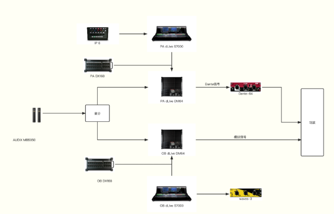OB調(diào)音臺(tái)至擴(kuò)聲系統(tǒng)通過(guò)傳統(tǒng)的模擬信號(hào)進(jìn)行傳輸,并在OB房間的S7000臺(tái)面上加裝了一張Waves卡 用于OB混音。