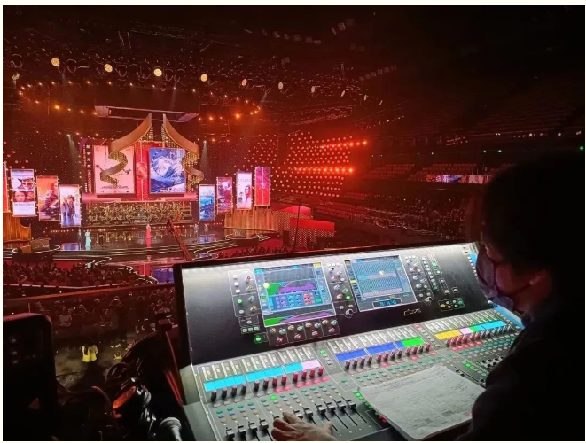 我公司設(shè)計(jì)團(tuán)隊(duì)為西安曲江競(jìng)技中心提供了固定安裝部分的擴(kuò)聲系統(tǒng)解決方案。本屆電影節(jié)開(kāi)、閉幕式現(xiàn)場(chǎng)使用了兩張Allen&Heath dLive S7000調(diào)音臺(tái)分別作為PA和OB調(diào)音臺(tái),搭配兩個(gè)DM64引擎作為處理核心。
