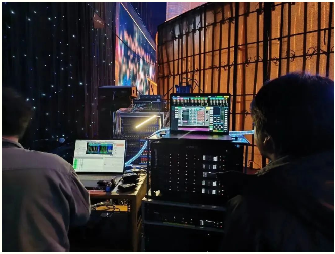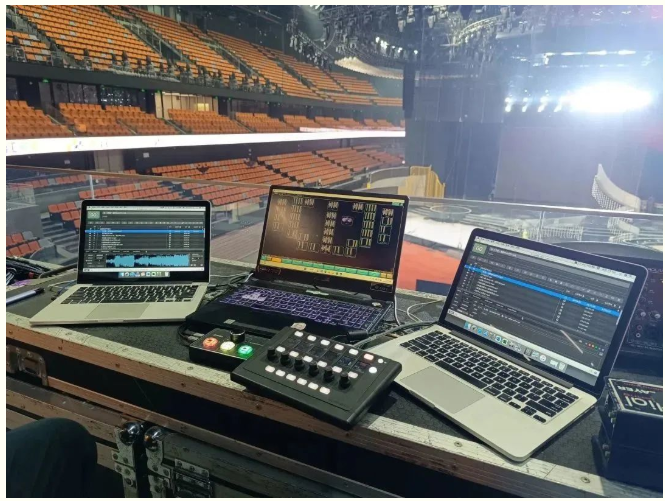 在前期進(jìn)場(chǎng)搭建時(shí),因遲遲無(wú)法確定PA控臺(tái)的最終位置,所以選擇了使用電腦端的Allen&Heath dLive director控制軟件與現(xiàn)場(chǎng)PA調(diào)音臺(tái)和OB調(diào)音臺(tái)的混音機(jī)架進(jìn)行連接,從而快速方便地應(yīng)用于前期的系統(tǒng)調(diào)試工作,使音頻工程師免于在3樓控臺(tái)到1樓舞臺(tái)之間奔波。