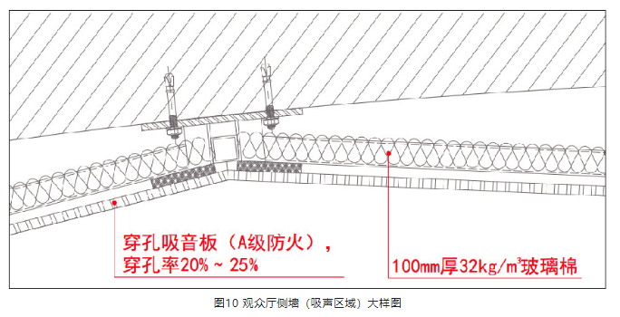 3) 側(cè)墻中段內(nèi)凹區(qū)域(圖4玫紅色墻面),2 m 以下人員活動(dòng)高度范圍內(nèi)(圖9),保留裝飾做法,做強(qiáng)吸聲處理,避免聲聚焦。穿孔吸音板穿孔率20%~25%,板后應(yīng)形成封閉空腔,空腔內(nèi)填100 mm厚32 kg/m3玻璃棉,見(jiàn)圖9、圖10。側(cè)墻吸聲區(qū)域與非吸聲區(qū)域裝飾效果保持統(tǒng)一。