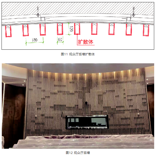 4) 裝飾在后墻(圖4磚紅色墻面)設(shè)置了豎向造型線條,將功能性與裝飾性相結(jié)合,能與墻面造型及飾面材料有機(jī)融合。室內(nèi)設(shè)計(jì)在側(cè)墻飾面材料拼縫間規(guī)律設(shè)置豎向LED燈帶,后墻豎向線條與側(cè)墻飾面材料風(fēng)格和諧統(tǒng)一。該豎向擴(kuò)散體寬度60 mm,突出高度120 mm,間距180 mm,擴(kuò)散體尺寸較小。見(jiàn)圖11、圖12。