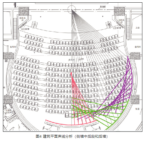 5) 側(cè)墻后段內(nèi)凹區(qū)域(圖4綠色色墻面)聲聚焦程度較弱,且聚焦點(diǎn)不在觀眾席。該區(qū)域如果做吸聲處理,會(huì)導(dǎo)致廳內(nèi)吸聲過(guò)量;如果做擴(kuò)散處理,與側(cè)墻其他區(qū)域裝飾風(fēng)格不統(tǒng)一,略顯突兀。因此,側(cè)墻后部?jī)?nèi)凹區(qū)域未做處理。