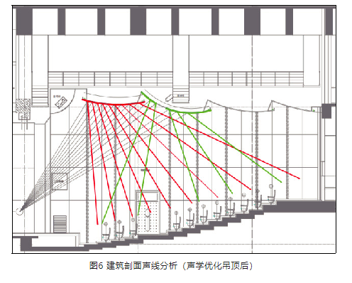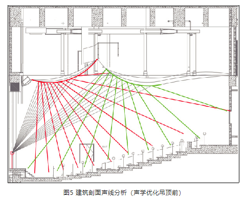 建筑剖面聲線分析(聲學(xué)優(yōu)化吊頂前)見(jiàn)圖5,建筑剖面聲線分析(聲學(xué)優(yōu)化吊頂后)見(jiàn)圖6。