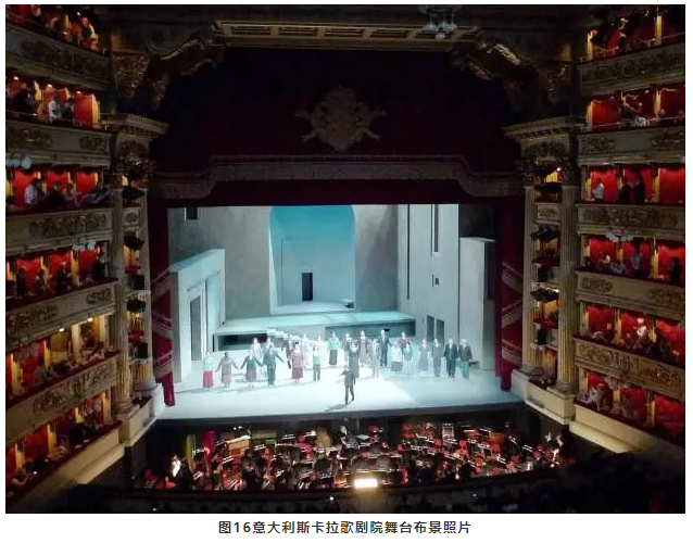 對于歌劇演出來說,舞臺上的聲學條件很重要,尤其是對歌手來說。舞臺內唯一可能為歌手提供早期反射的表面就是舞臺布景,所以一般都會設置類似反聲罩的布景(見圖15、16)。這種措施不僅是歌劇劇情演出的需要,還可以起到提高歌手之間的相互聽聞和響度的作用。