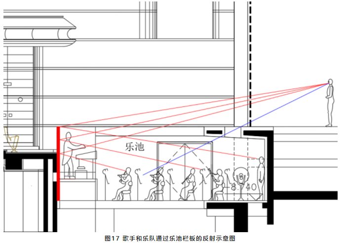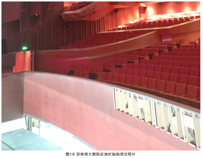 由于樂池的下沉,歌手和樂隊彼此之間大多數看不到對方,也就是說他們之間缺乏直達聲進行交流,通過反射面提供<35ms的早期反射聲進行交流就至關重要。樂池欄板是歌手和樂隊之間最近的反射面(見圖17),因此欄板必須是硬的反射面。蘇州灣大劇院樂池的右側欄板采用透空做法(見圖18),優點是可以提高了樂隊的聲級特別是高頻聲,增加樂隊演奏聲的亮度。但是卻產生了三個不利因素:一是打破了歌手和樂隊之間的平衡,使樂隊聲能可能蓋過了歌手;二是減少了歌手和樂隊之間的早期反射聲交流,不利于演出的同步性;三是觀眾可以隱約看到樂譜燈光,干擾觀看演出。綜合考慮這種做法并不可取。