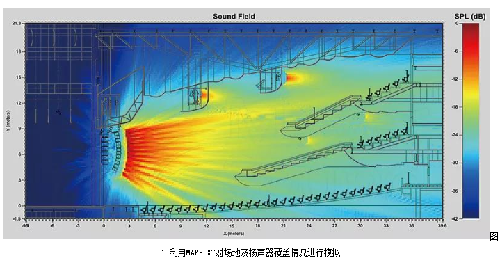 當獲得足夠的場地信息之后,需要利用揚聲器廠家提供的模擬軟件(或者通過Ease Focus這種基于GLL文件的通用設(shè)計軟件)進行建模,這些軟件可在可視化的條件下,實時調(diào)整并計算不同設(shè)計方案的覆蓋均勻度以及聲壓級分布,較為復雜的模擬軟件(如Ease)甚至可以將反射和墻面材質(zhì)的吸聲特性都考慮在內(nèi),實現(xiàn)對反射情況的模擬(見圖1)。系統(tǒng)建模和預測的重要作用在于讓系統(tǒng)工程師在裝臺開始之前就能夠做好全部的計劃和準備工作,進而起到減少正式施工時長并提高工作效率的作用。