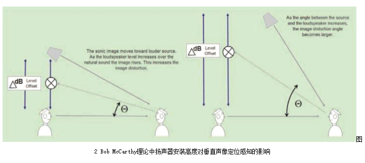 任何解決方案都存在一定的局限性。這些局限性主要來自于劇場的尺寸、舞臺的結(jié)構(gòu)、觀眾席座位的分布以及劇場的聲學環(huán)境等要素。使用中置揚聲器對于那些舞臺鏡框特別高的場地可能不是一個好的選擇。吊掛的高度決定了聲源發(fā)出的位置(見圖2),若揚聲器與觀眾席垂直方向的夾角大于30°,位于前排的觀眾就有可能會感覺到垂直方向上的聲像漂移,產(chǎn)生人聲或?qū)Π讈碜灶^頂而非前方的感覺。此時,設(shè)計時可以考慮通過臺唇補聲系統(tǒng)來覆蓋前排觀眾席,中置系統(tǒng)從3排或4排之后的區(qū)域開始覆蓋。