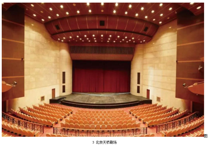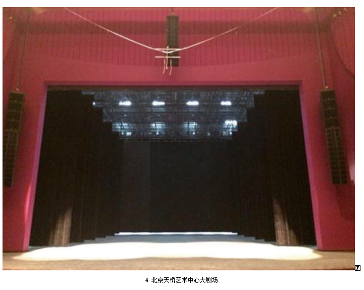 標準劇場中,中置揚聲器組的安裝通常分為暗裝和明裝兩種。暗裝一般是安裝在舞臺鏡框上沿預留的聲橋當中,如北京天橋劇場(圖3)。明裝則是吊掛在舞臺燈桿或預留的吊點上,如北京天橋藝術(shù)中心大劇場(圖4)。暗裝對觀眾的視覺影響最小,如果劇場擴聲系統(tǒng)設(shè)計合理,建筑聲學指標達標,且在鏡框高度不是很高的情況下,劇場中置聲道暗裝是最好的安裝方式。但是國內(nèi)劇場的實際情況并不樂觀,且不同演出的系統(tǒng)工程師和音響設(shè)計師都有各自的設(shè)計和考量,暗裝中置聲道位置又基本不可調(diào)整,所以很多劇場中暗裝的中置聲道使用率很低。明裝的中置聲道更便于安裝、拆卸以及調(diào)整,更加適合流動性強的演出,因此,越來越多的現(xiàn)代化劇場采用這種安裝方式。