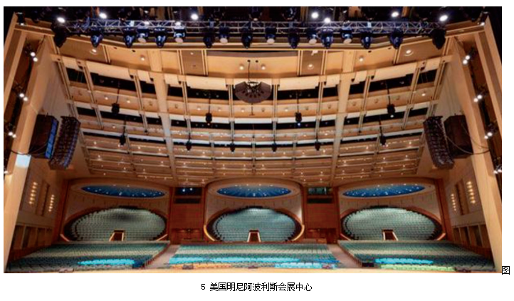 此外,還有一些劇場由于應用場景的不同,揚聲器系統(tǒng)既要減少舞臺垂直方向上對觀眾的視覺影響,還要滿足較寬觀眾席對水平覆蓋的需求。例如美國明尼阿波利斯會展中心使用ARCS恒定曲率線陣列揚聲器,這種揚聲器陣列在垂直方向上的輻射角度不可調(diào)整,但水平角度上中置揚聲器幾乎可以覆蓋到整個觀眾席,甚至可以比左右聲道揚聲器承擔更大的功率,這對于以語言類為主的會議等應用場景來說是十分方便且有效的。