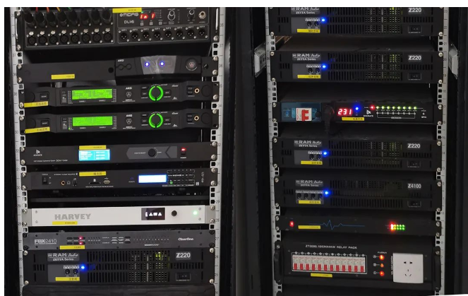 小報(bào)告廳左右主擴(kuò)采用德國(guó)TWAUDiOT20N點(diǎn)聲源 2只,搭配4只緊湊型超低B17i,拉聲像則由2只T20i點(diǎn)聲源負(fù)責(zé),后場(chǎng)補(bǔ)聲和舞臺(tái)返送則分別由左右鏡像對(duì)稱的全頻揚(yáng)聲器M12i和M12擔(dān)任,整個(gè)系統(tǒng)依然由RAM AudioZETTA系列功放進(jìn)行驅(qū)動(dòng)。